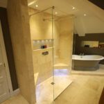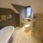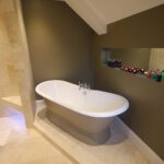 This master en-suite is tiled in our Premium Latte Travertine and painted Farrow & Ball Mouse’s Back.