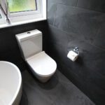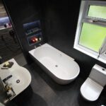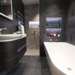 Luxury black slate porcelain bathroom with Ebb bath and Acquabella Focus shower tray