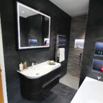 The gorgeous Palace basin from Laufen. Swiss quality products. The soft curve leads you into the bathroom, replicated with the offset nature of the bath. Above, an LED lit recess mirror framed in black stained oak.