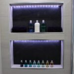 The slate backed LED lit storage recesses tie in nicely with the floating basin area.