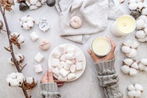 Female workspace in pastel tones. Marshmallows, cotton, candles top view on white marble background