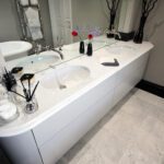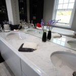 We created a beautiful Carrara marble surface with waterfall edge detail. Undermount oval basins from Ceramica Catalano.