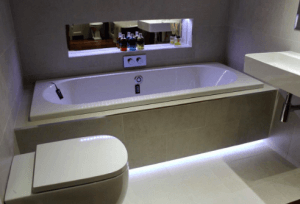 The Britton Bathroom Verde double ended bath. In this image it is partnered perfectly with a Laufen Bathrooms Palomba back to wall WC and Bathroom Brands digital shower.