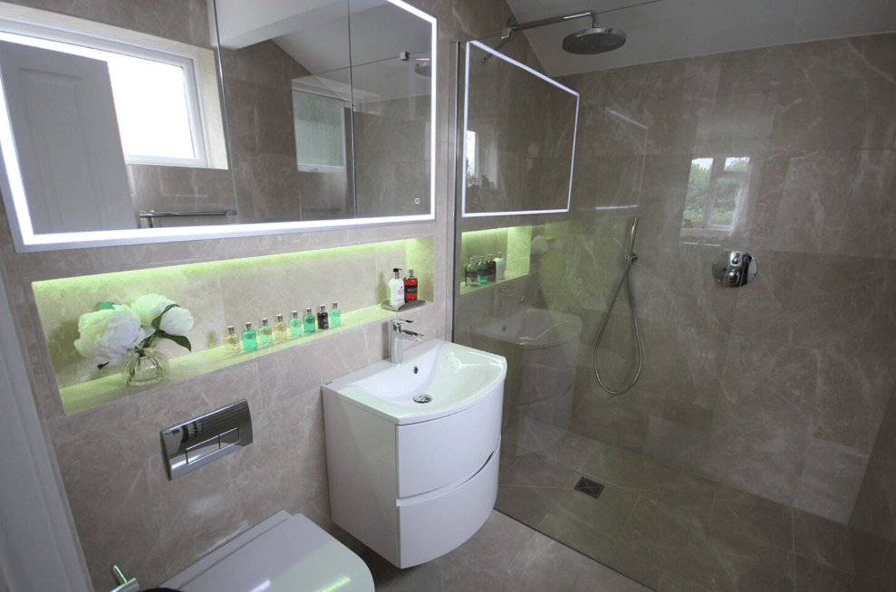 We also used marble in the simple and elegant guest en-suite pictured below. This en-suite features a spectacular shower that takes up the width of the room. The tiling in Italian Botticino marble is wonderfully offset by the colour changing LED lighting. This particular system is controlled via an app on your phone and provides over 2.1million colours!