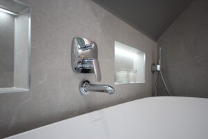hansgrohe bath shower mixer with separate spout and handshower.