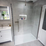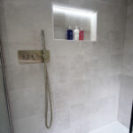 A large spacious walk in shower with Brushed Nickel brassware. Laufen marbond shower tray and handy recessed LED lit shelf.
