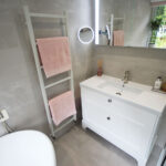 Miller Kensington floorstanding double drawer vanity. Coalbrook monobloc basin mixer pairs beautifully with the soft tones of the room.