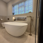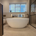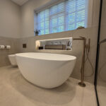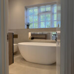 The statement bath, positioned beneath the window and perfectly aligned with the bespoke mirror recess, forms the visual and emotional centre of the room. The Victoria + Albert Barcelona freestanding bath, in matt white, invites quiet reflection, while the floor-standing AXOR Citterio C mixer in brushed bronze adds a sculptural touch that catches the soft light.