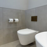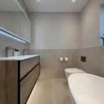 The Laufen Kartell wall-hung WC with TECEsolid brushed bronze flush plate continues the theme of refined simplicity. Opposite, the Minore solid surface double basin rests on the Urban Frame vanity, where natural oak drawers are framed in matt black, creating a delicate balance of light and shadow. AXOR Citterio C basin mixers and coordinating push-open wastes in brushed bronze bring a sense of quiet precision.