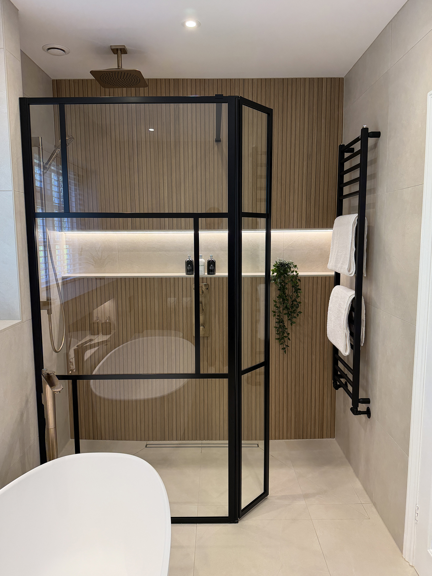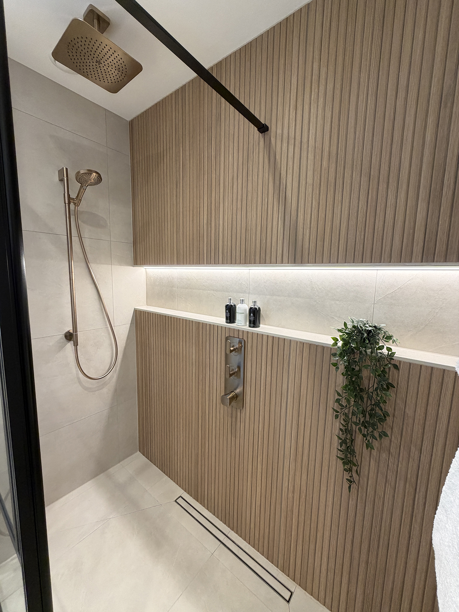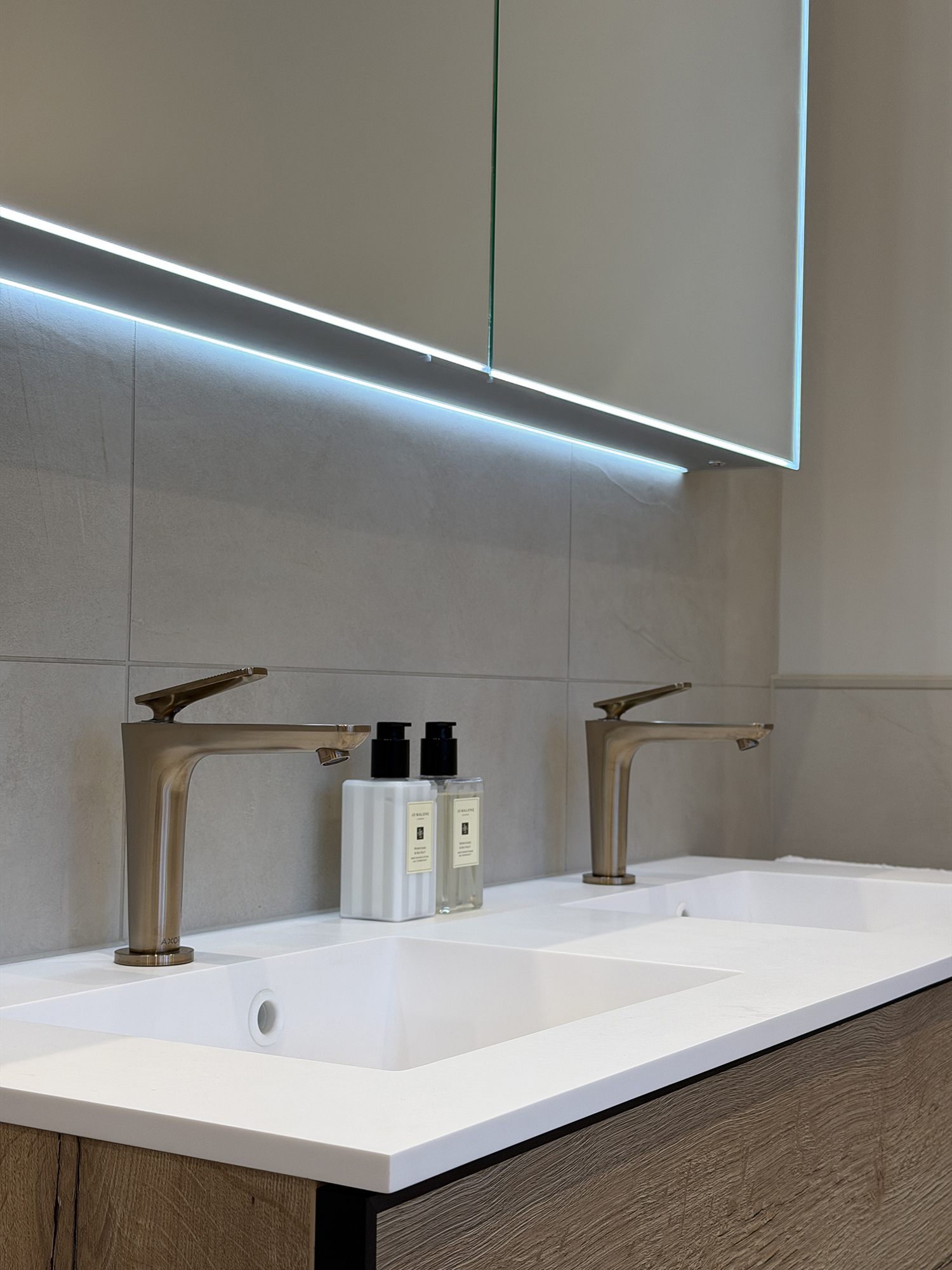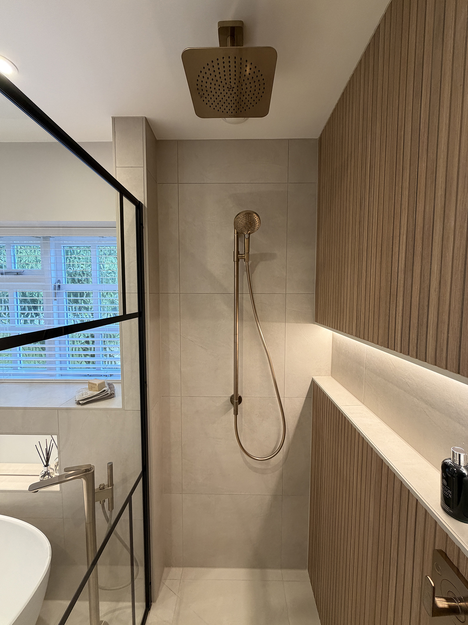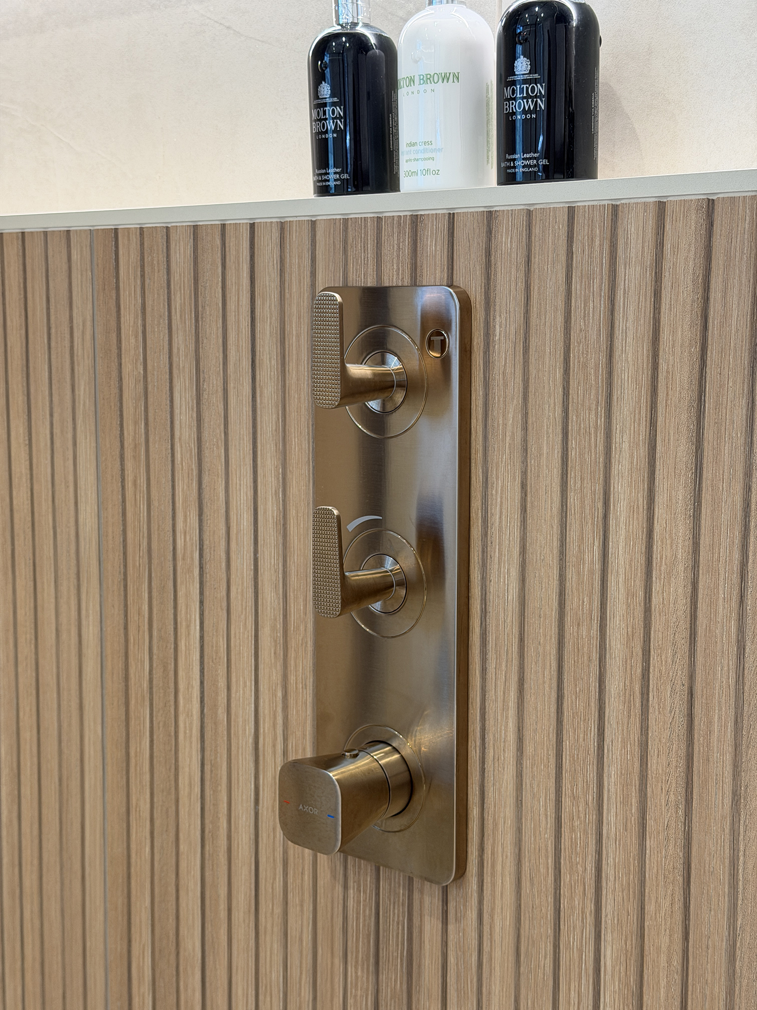 Every element — from the Zehnder Stellar Spa towel rail to the AXOR thermostatic modules — enhances the quiet sophistication of this design. This is a bathroom defined by harmony, restraint, and sensory balance: a true expression of Japandi serenity in bronze, wood, and quiet light.