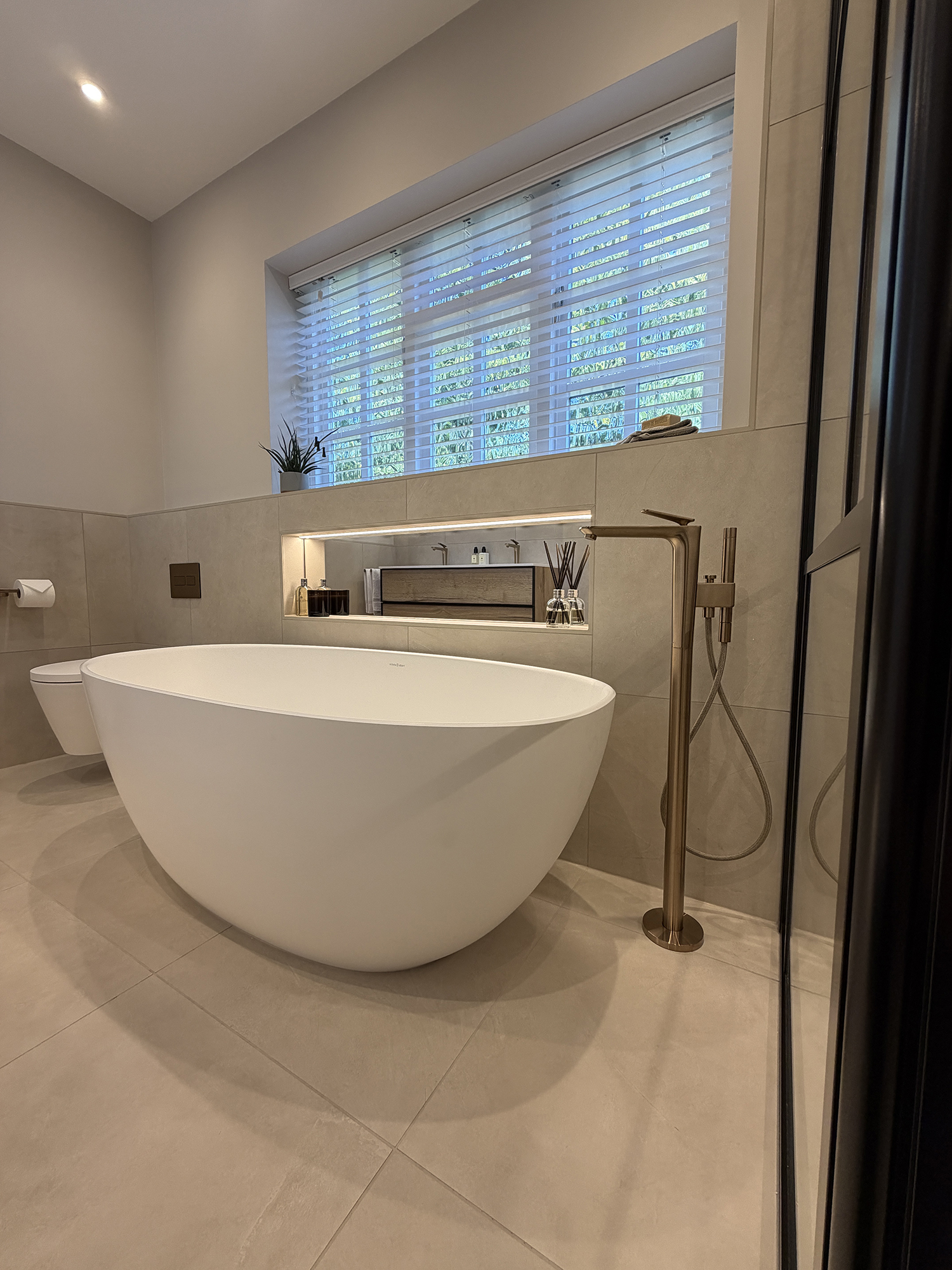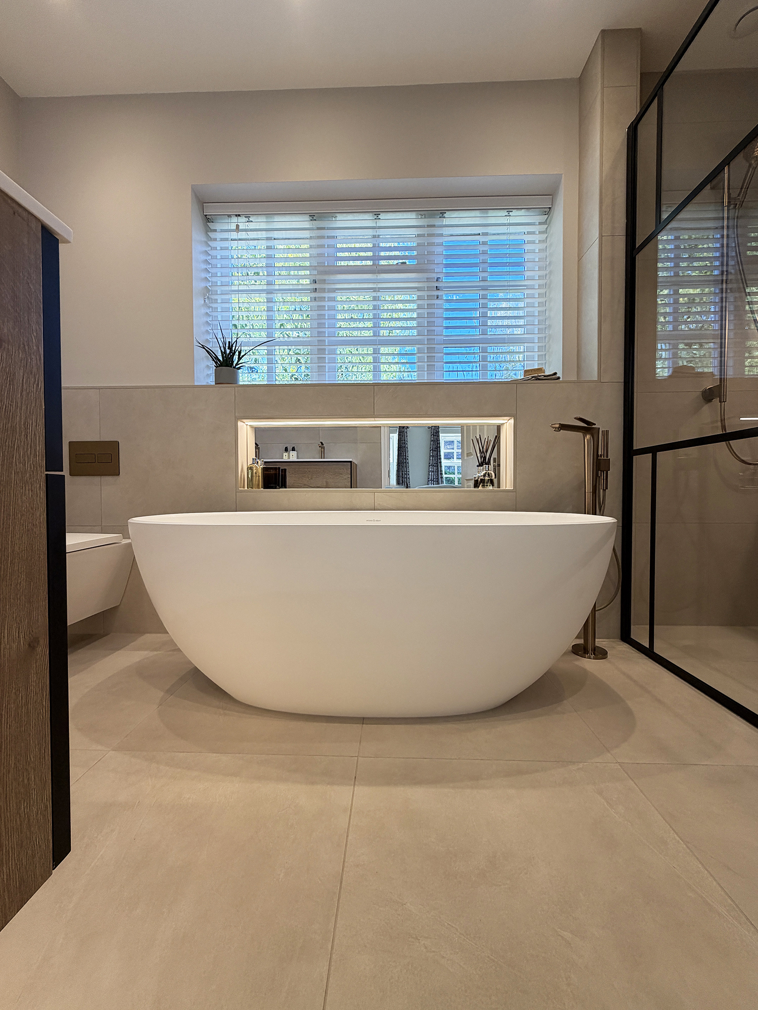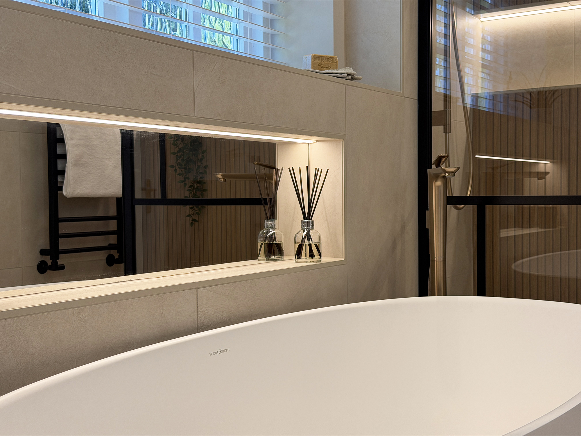 The statement bath, positioned beneath the window and perfectly aligned with the bespoke mirror recess, forms the visual and emotional centre of the room. The Victoria + Albert Barcelona freestanding bath, in matt white, invites quiet reflection, while the floor-standing AXOR Citterio C mixer in brushed bronze adds a sculptural touch that catches the soft light.