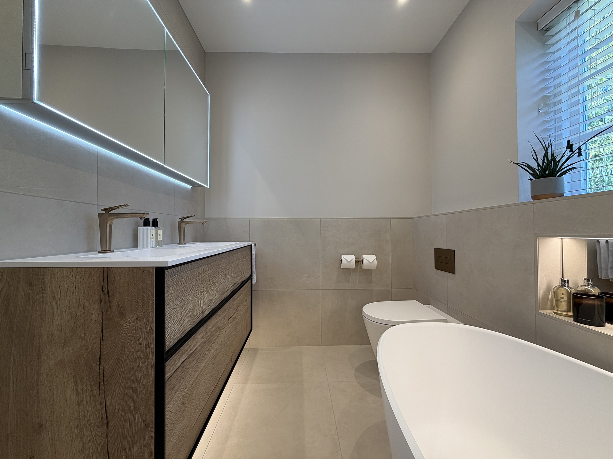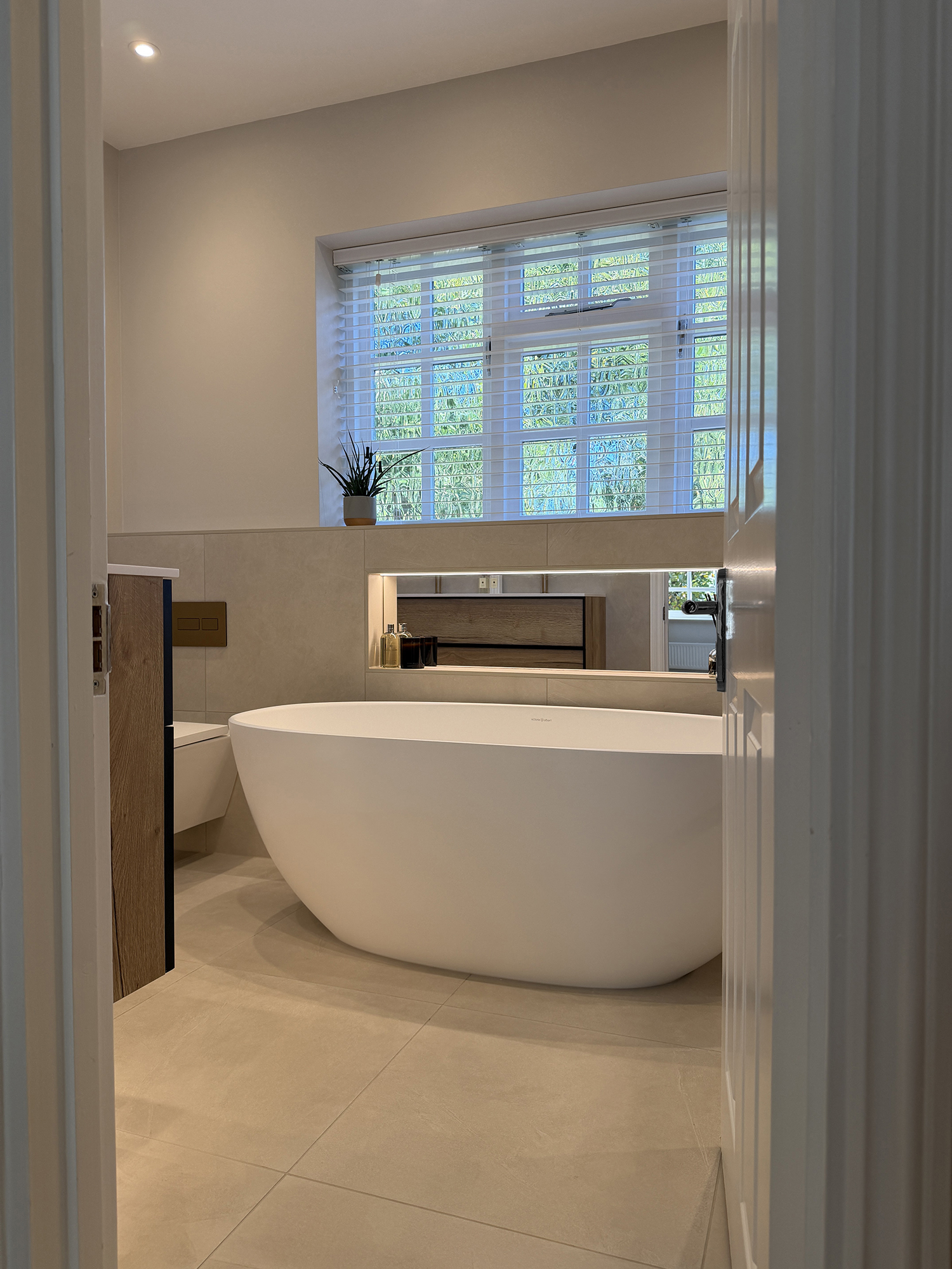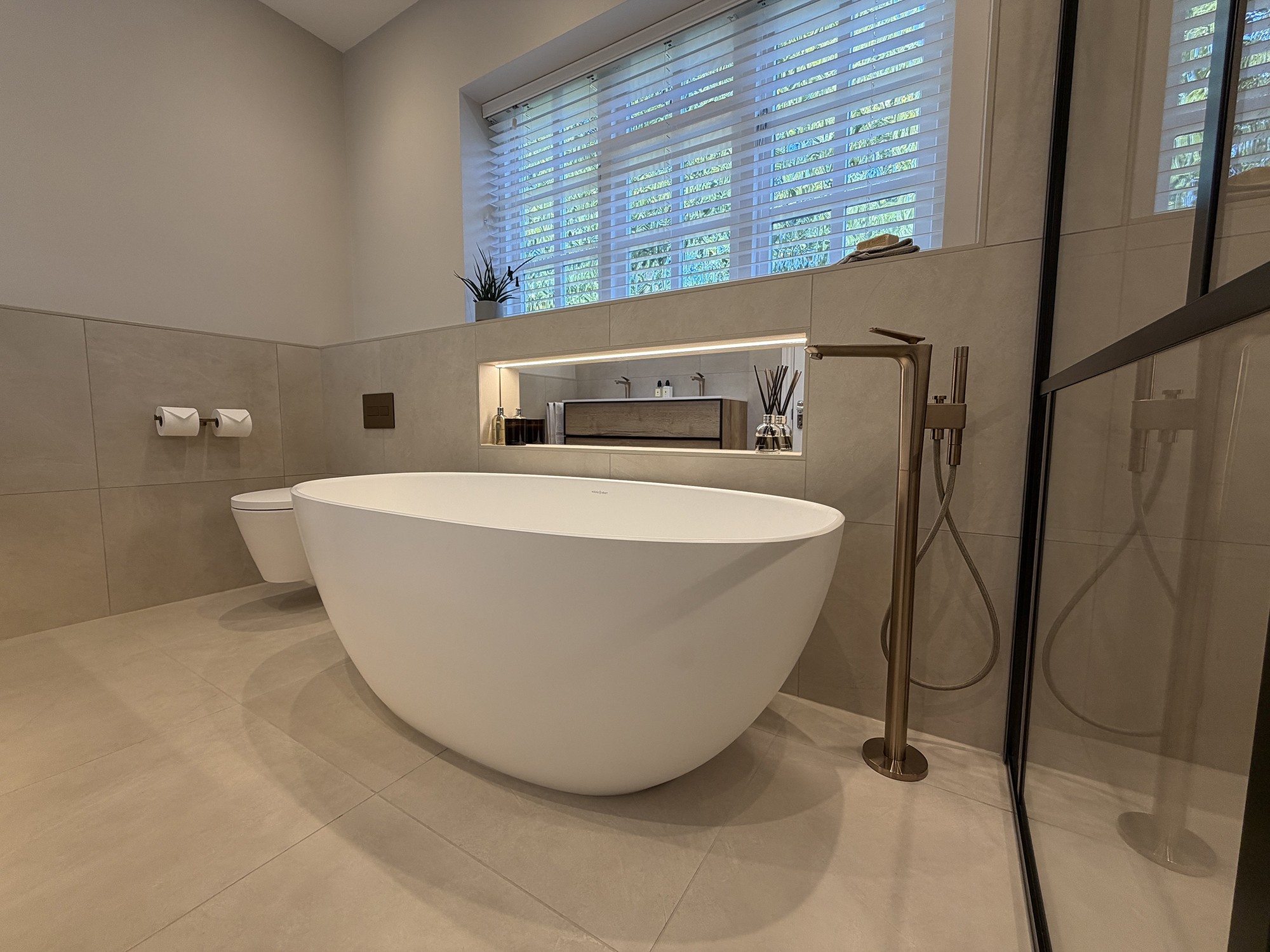 The statement bath, positioned beneath the window and perfectly aligned with the bespoke mirror recess, forms the visual and emotional centre of the room. The Victoria + Albert Barcelona freestanding bath, in matt white, invites quiet reflection, while the floor-standing AXOR Citterio C mixer in brushed bronze adds a sculptural touch that catches the soft light.