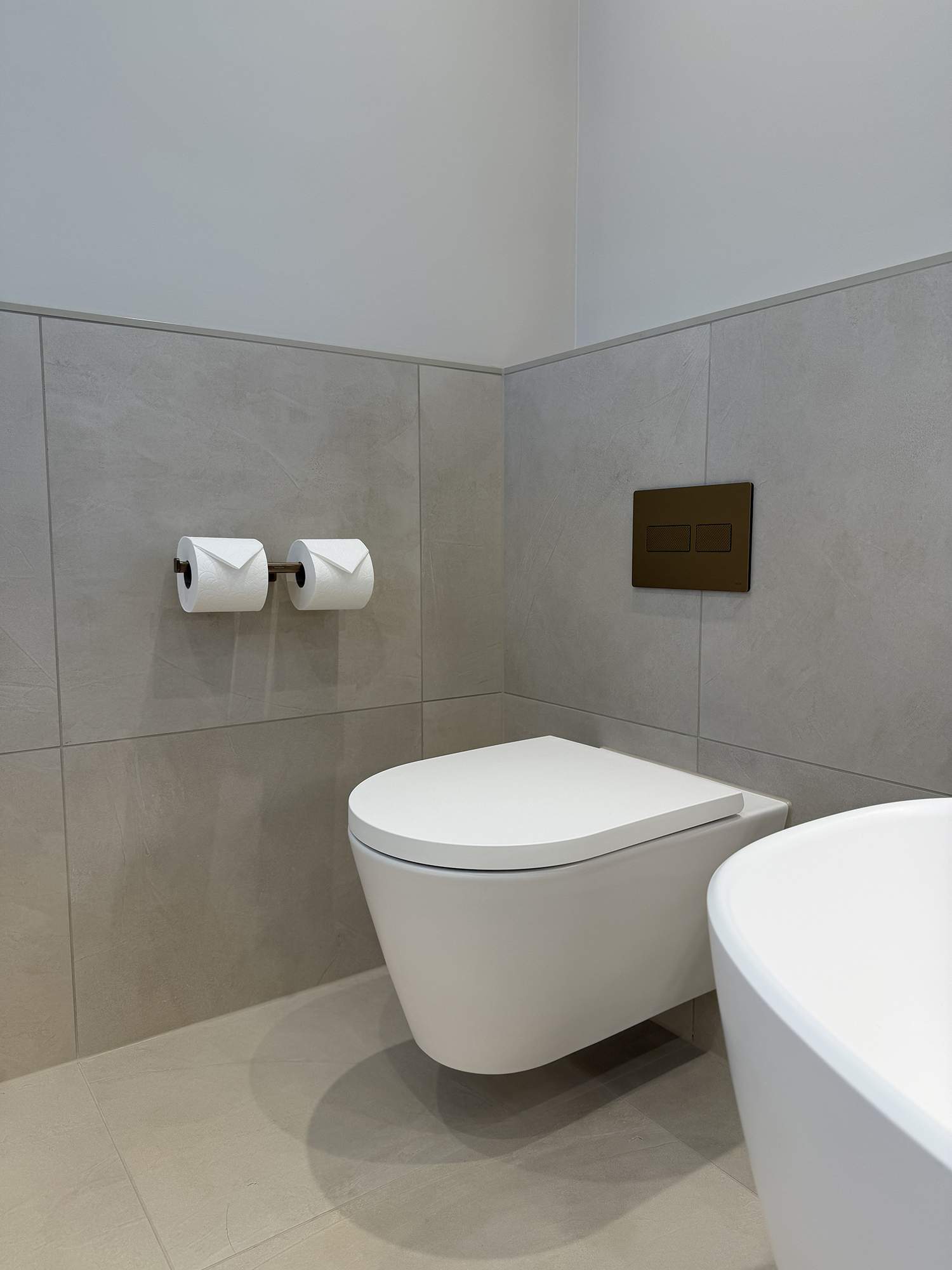 The Laufen Kartell wall-hung WC with TECEsolid brushed bronze flush plate continues the theme of refined simplicity. Opposite, the Minore solid surface double basin rests on the Urban Frame vanity, where natural oak drawers are framed in matt black, creating a delicate balance of light and shadow. AXOR Citterio C basin mixers and coordinating push-open wastes in brushed bronze bring a sense of quiet precision.