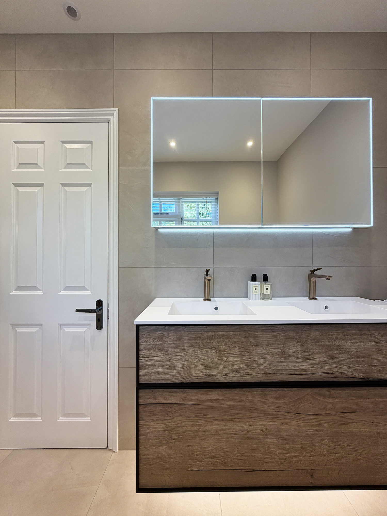 Soft, layered illumination shapes the space — the Exos LED mirror cabinet casts an even, warm glow, while ceiling downlights and subtle LED accents trace architectural lines around the bath, basin, and shower.
