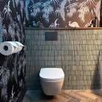 This moody, design-led cloakroom is anchored by the iconic Laufen Alessi 1200 washbasin, its fluid form paired with the minimal elegance of a wall-mounted AXOR One mixer in brushed black chrome. The concealed setup and sculptural basin create a focal point that feels both contemporary and timeless.