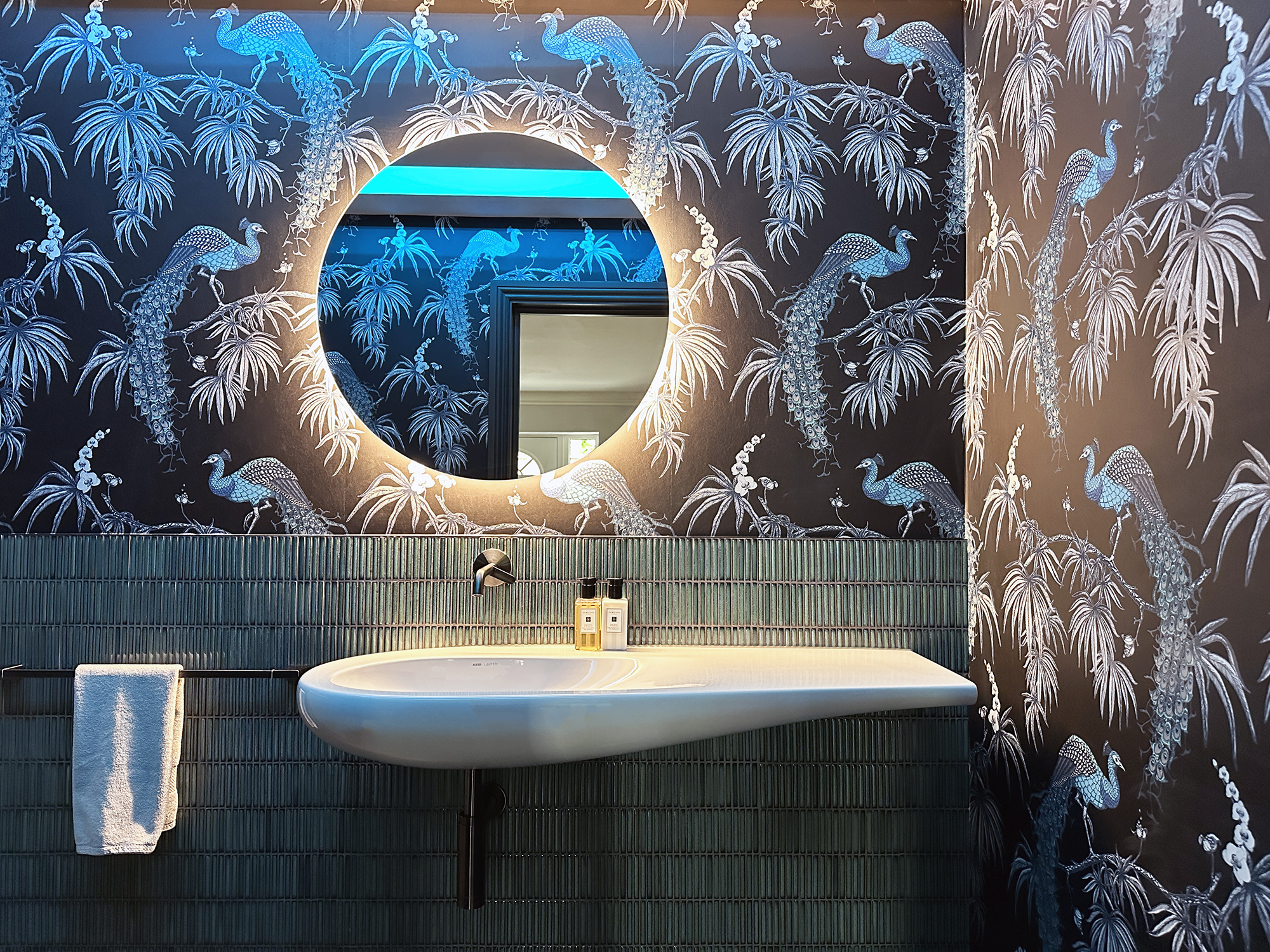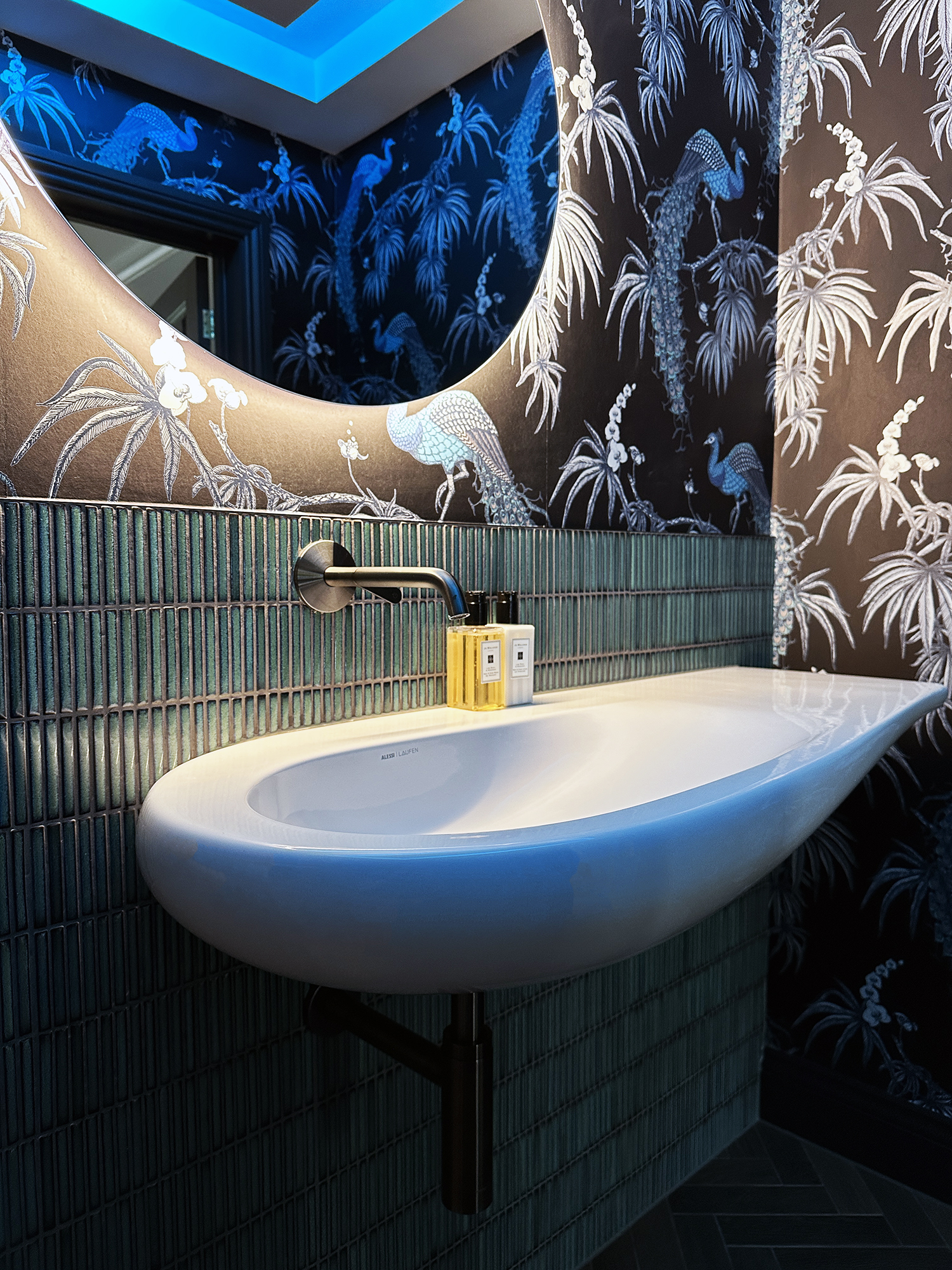 This moody, design-led cloakroom is anchored by the iconic Laufen Alessi 1200 washbasin, its fluid form paired with the minimal elegance of a wall-mounted AXOR One mixer in brushed black chrome. The concealed setup and sculptural basin create a focal point that feels both contemporary and timeless.