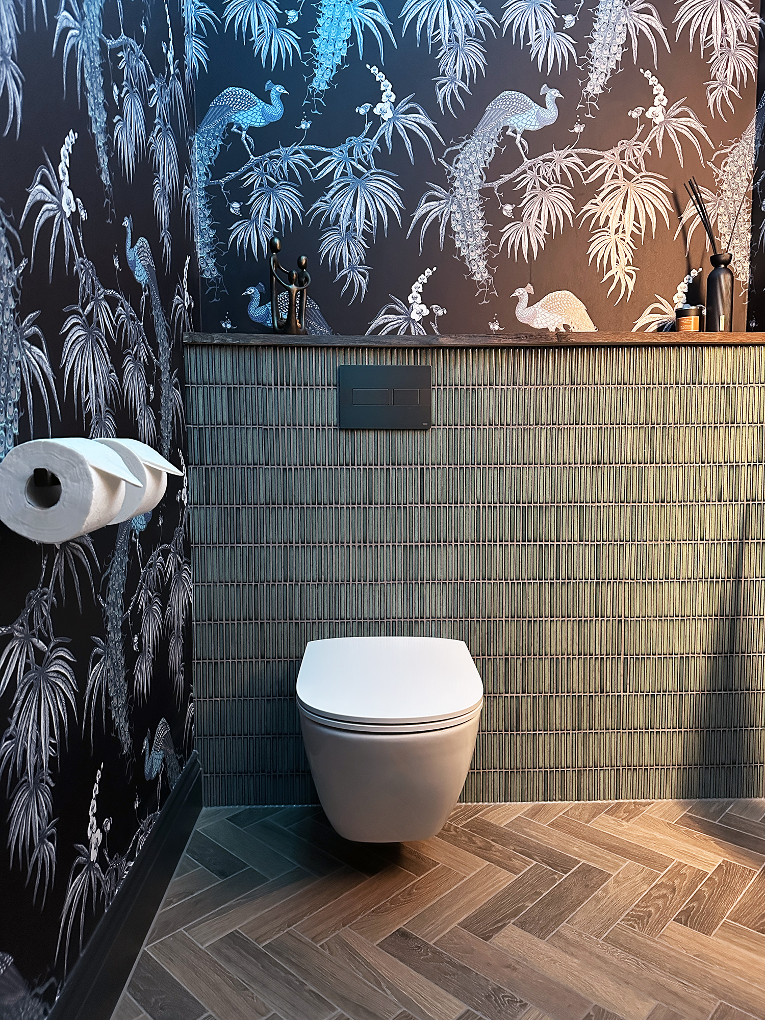 Bamboo Verdigris mosaic tiles form a richly textured backdrop, while Faubourg Brun herringbone flooring adds warmth and grounding. The palette is quiet and considered—deep greens, natural wood tones, and muted metals.