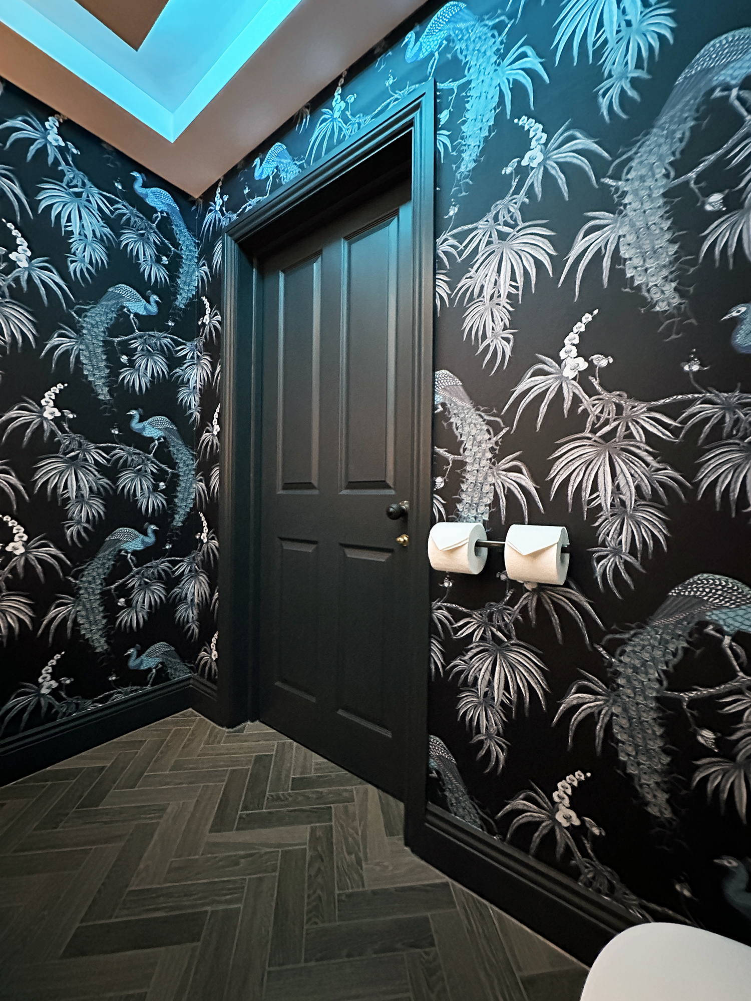 Compact in scale but rich in atmosphere, this cloakroom is a study in calm, contrast, and material refinement.