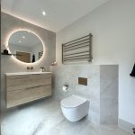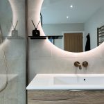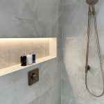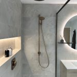 The spacious wet-room shower features a Drench border pivot flipper panel in brushed light bronze, a hansgrohe Croma 280 overhead shower, and an AXOR One rail with PowderRain technology, all enhancing the spa-like experience. Finishing touches include a heated towel rail, LED-lit mirror with a demister pad, and subtle accent lighting in the shower recess for added ambiance.