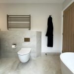 A statement Urban You double-drawer vanity in natural oak brings warmth and practicality, complemented by sleek brushed bronze brassware from hansgrohe and AXOR. The Ebb semi-freestanding bath invites relaxation, paired with a concealed DuoTurn Q mixer and Exafill overflow filler for a seamless, minimalist aesthetic.