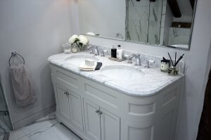 The main feature of the bathroom is the stunning his and hers vanity unit. We constructed this in Oak and painted it with Farrow & Ball Pavilion Gray. We then used a Carrera Marble worktop with under mount basins and Perrin & Rowe traditional three tap hole basin mixers. This unit is both practical and stylish, providing ample storage space but with a timeless, classic look. The unit is finished off perfectly with the addition of a bespoke bevelled mirror with wall mounted lights.